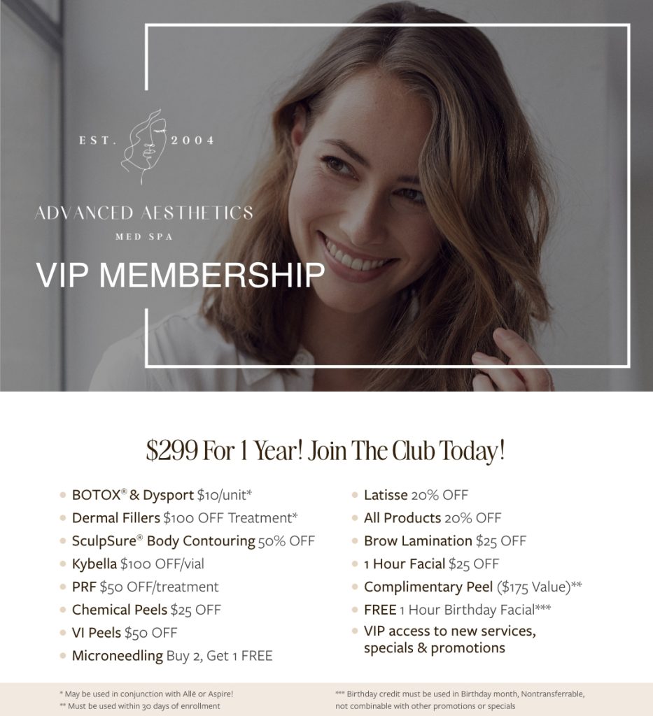 Our VIP Membership is designed to make your care more rewarding. Enjoy preferred pricing on the treatments you love most, along with special benefits that keep your aesthetic journey simple and seamless.